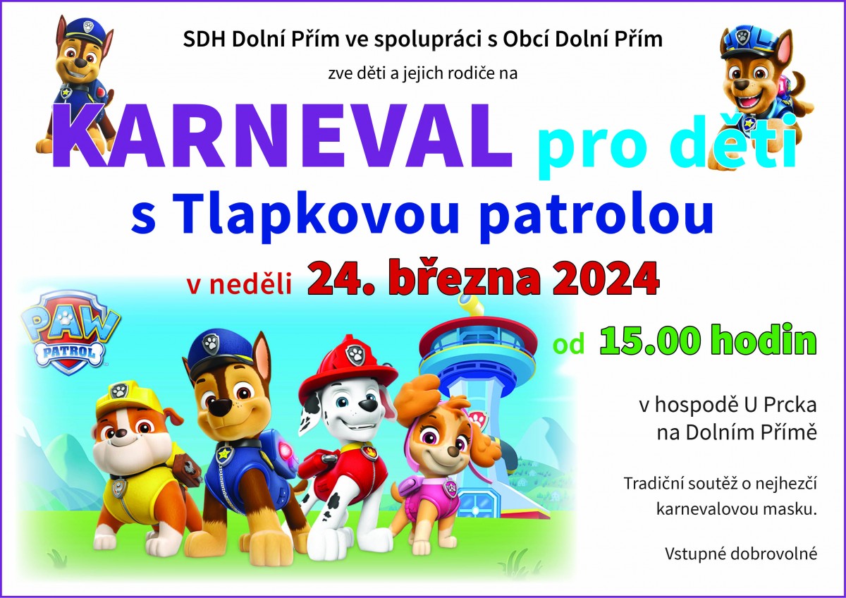 Srdečně zveme všechny děti, které maji rády hrdiny z Tlapkové patroly na karneval pro děti. Odpoledne plné soutěží, tance, radovánek a samozřejmě tradiční soutěž o nejhezčí masku. Na karneval mohou přijít i děti, které mají raději jiné pohádnové hrdiny :-) .
